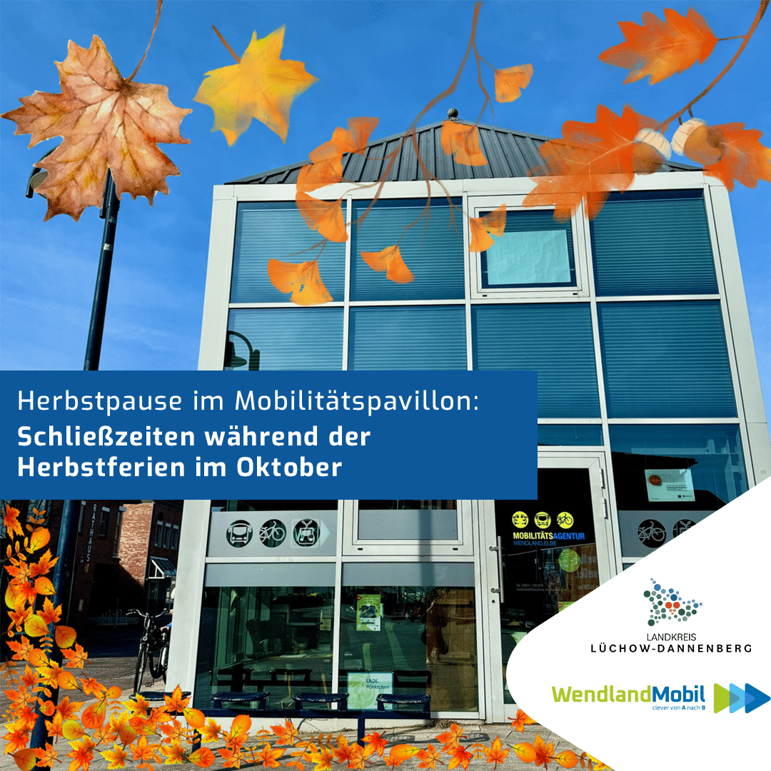 Vom 15. bis 22. Oktober 2025 bleibt der Mobilitätspavillon am Lüchower Busbahnhof geschlossen. An den übrigen Tagen der Herbstferien berät das Team zu den regulären Öffnungszeiten: Montag, Dienstag und  Donnerstag von 9 bis 12 und 13 bis 15 Uhr, am Freitag von 9 bis 12 Uhr.