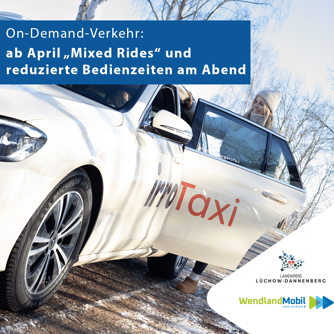 Ab 1. April 2026 ändern sich die Rahmenbedingungen für den On-Demand-Verkehr im Landkreis Lüchow-Dannenberg. Die Fahrten mit dem On-Demand-Taxi, das man telefonisch oder per App buchen kann, finden dann nur noch als Fahrten zu einer bestehenden ÖPNV-Verbindung statt. „Diese Zu- und Abbringerfunktion ist ein zentrales Element von On-Demand-Verkehren“, erklärt Christopher Simon, Leiter der Stabsstelle Klimaschutz…