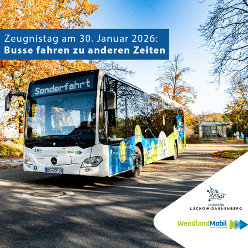 Am Freitag, 30. Januar 2026, werden in den Schulen im Landkreis Lüchow-Dannenberg die Zeugnisse vergeben. Der Unterricht endet in der Regel früher. Der kreiseigene Verkehrsbetrieb Lüchow-Schmarsauer Eisenbahn (LSE) passt darum an diesem Tag die Fahrtzeiten der Busse am Vormittag zwischen 10 bis 11.30 Uhr teilweise an. Einige Fahrten ab Mittag entfallen. Teilweise werden die gestrichenen…